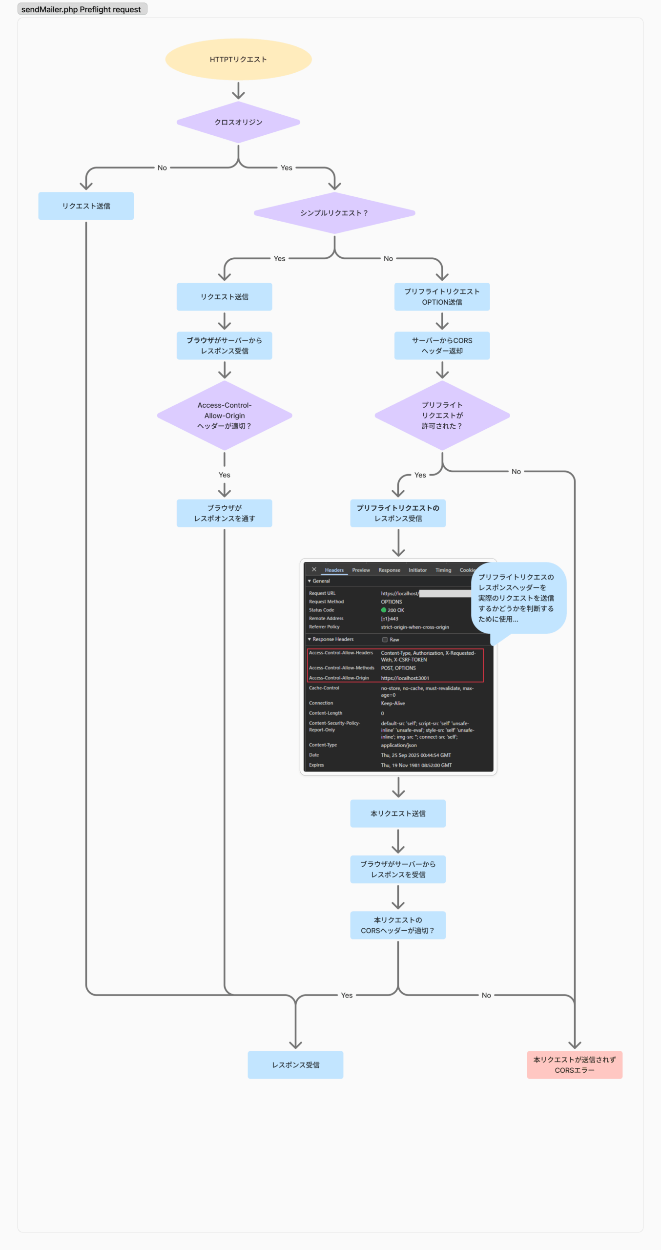 ブラウザがOPTIONSリクエストを送信 サーバーがCORS設定を返答 許可された場合のみ、本来のリクエストを送信