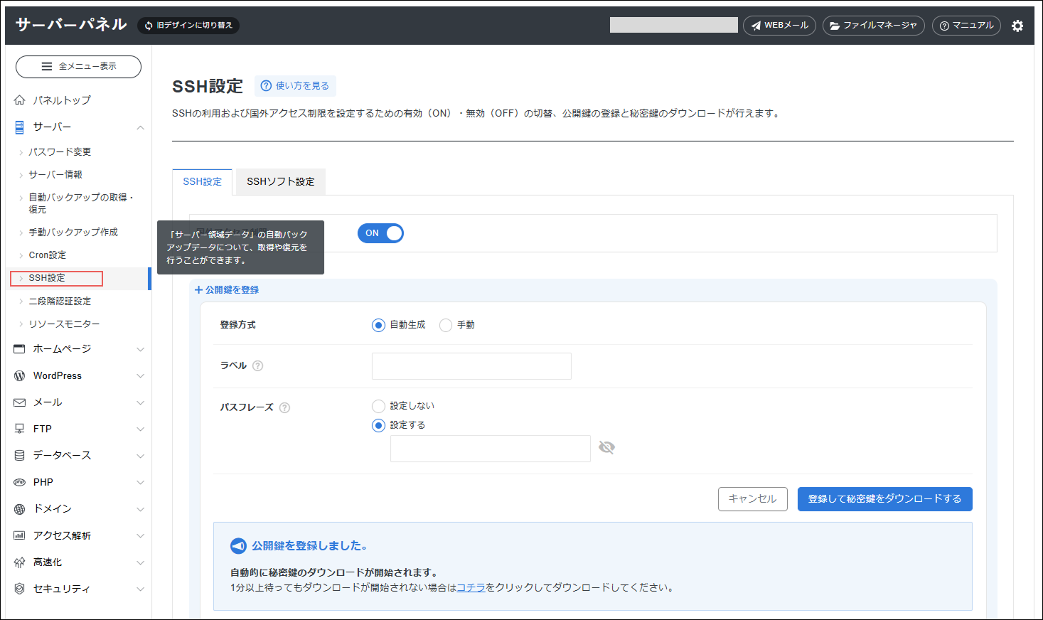 「SSH設定」をクリック→「ONにする」に変更して保存→「登録して秘密鍵をダウンロードする」