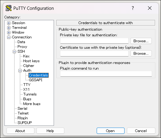 - 左メニュー「Connection」→「SSH」→「Auth」→「Creden~ials」