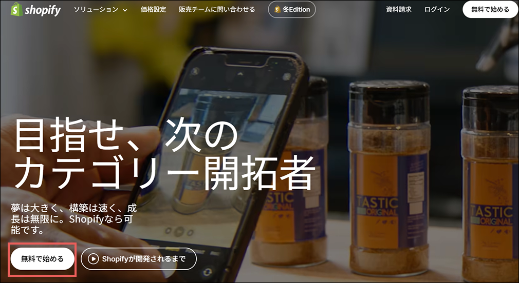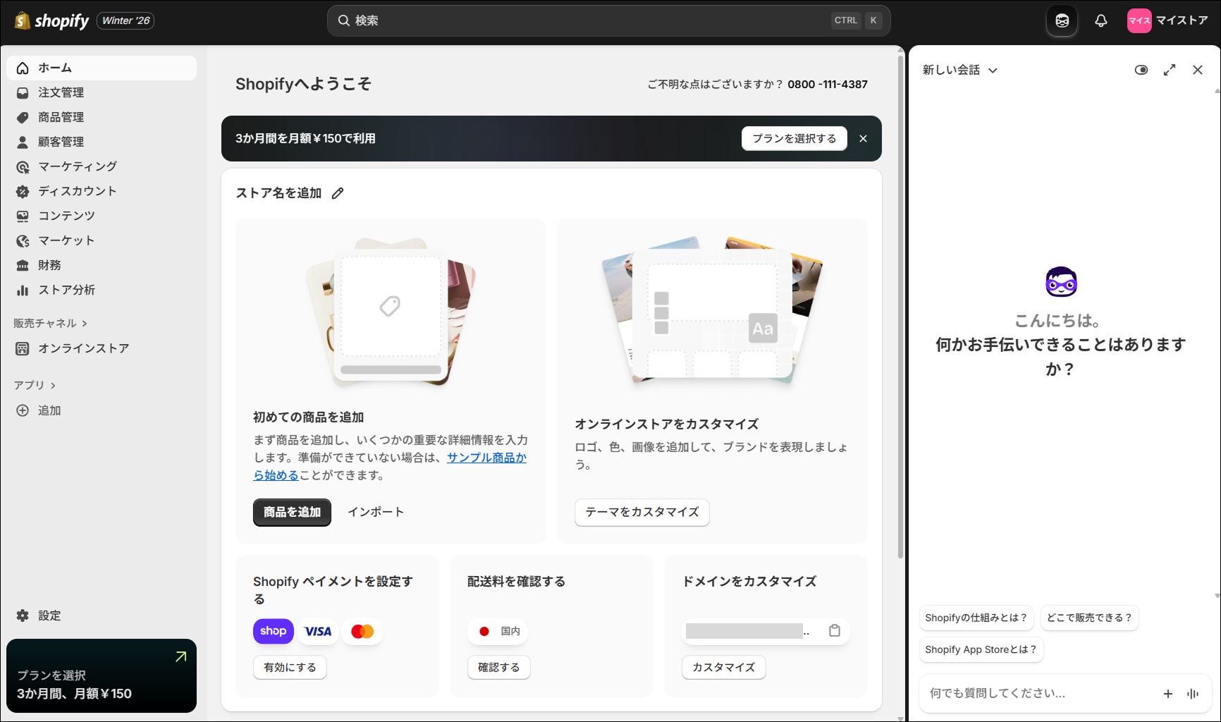 2025年12月現在Shopifyは、登録してから3日間は無料、その後も最初の3ヶ月は月額150円程度で使えます。