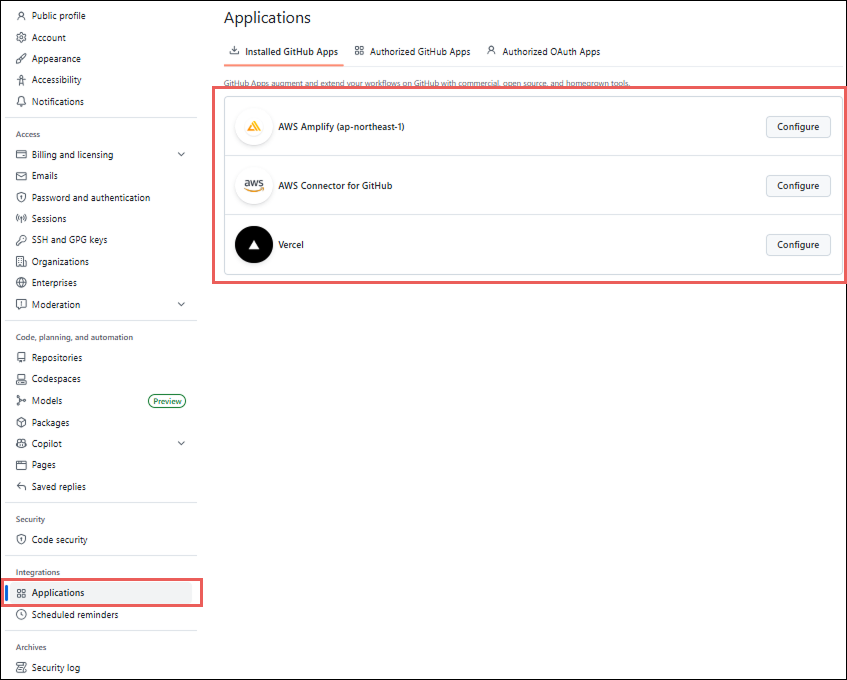 - GitHub Apps ← ここでインストール済みアプリを管理